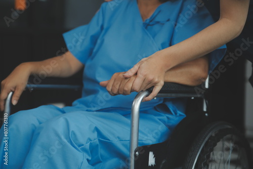 Doctor giving hope. Close up shot of young female physician leaning forward to smiling elderly lady patient holding her hand in palms. Woman caretaker in white coat supporting encouraging old person