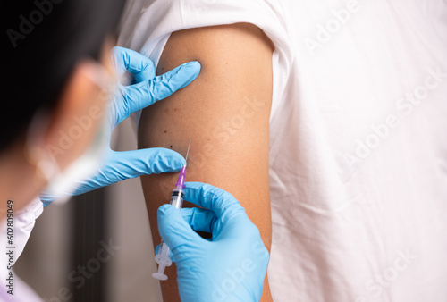 Doctor hand in blue gloves holding influenza vaccine for prevention human.Nurse holding syringe make injection in shoulder of patient in hospital.Covid-19 or coronavirus vaccine.