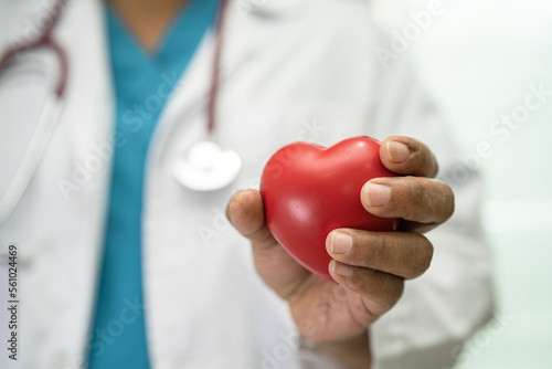 Doctor holding a red heart in hospital ward, healthy strong medical concept.