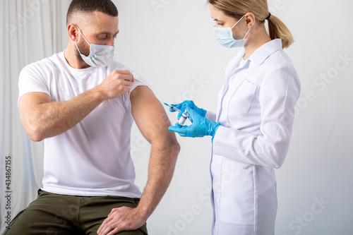 Doctor holding a syringe before injecting coronavirus vaccine into a male patient.