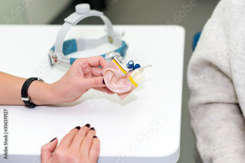 Doctor holding artificial human ear model shoving to the patient. Plastic colorful ear model. Medical theme or science classes.