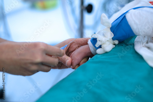 Doctor holding baby’s foot and injecting with needle to baby’s foot for drawing blood sample in cardiac operating room