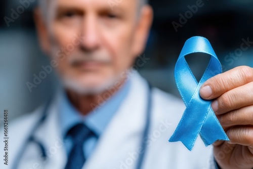Doctor holding blue ribbon, representing prostate cancer awareness, men's health, colon cancer awareness, and chronic fatigue syndrome