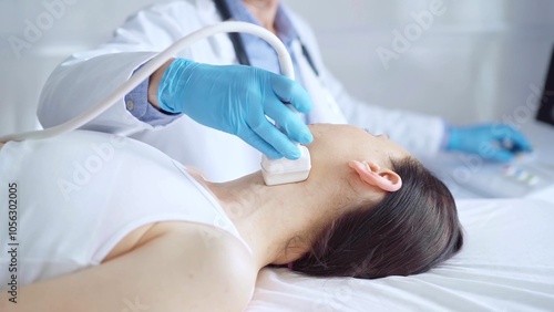 Doctor man wearing blue medical gloves is using ultrasound equipment on neck of female patient lying down for a medical examination