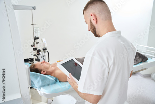 Doctor monitoring man before contrast-enhanced ECG-gated coronary CT angiography