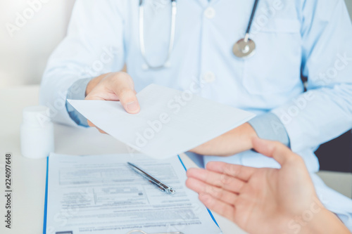 Doctor or physician writing diagnosis and giving a medical prescription to female Patient