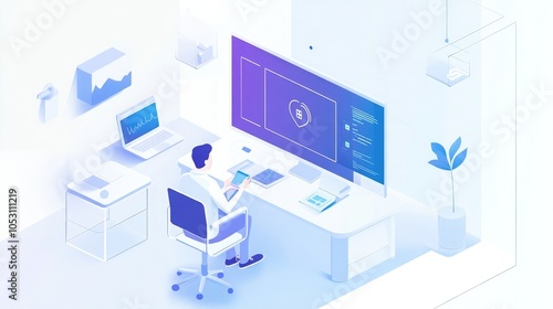 computer, three-dimensional, house, office, room, interior, home, business, building, design, plan, architecture, isometric, desk, construction, furniture, icon, vector, laptop, technology, apartment, table, illustration, chair, kitchen