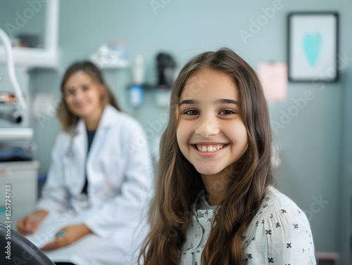doctor, young, girl, clinic, health care, check-up, smiling, medicals, dentist, appointment, exam, paediatrician, physician, well-being, routine, visit, teeth, hygiene, children, happy, confident, trust, communication, reassurance, support, eltern, guardian, comfort, chair, room, equipment, professional, care, dentistry, looking
