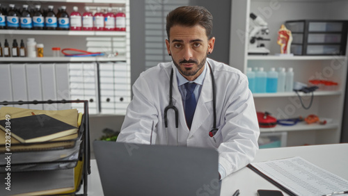 doctor, man, hospital, clinic, health care, office, professional, medicals, stethoscope, interior, male, adult, person, young, workplace, photogenic, indoor, room, attractive, portrait, hispanic, guy, laboratory, consultation, equipment, desk, medicine, workspace, health, care, healer, groomed, organised, business, consulting, treatment, latin, focused, serious, technology, computer, record, notebook