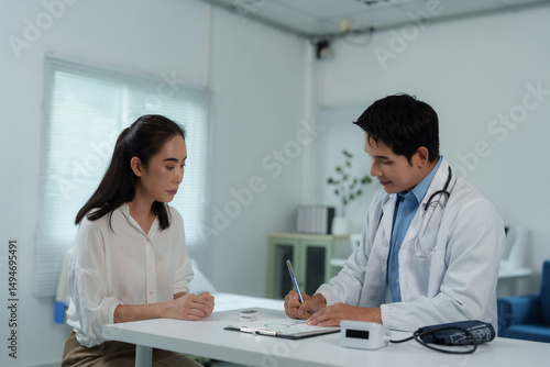doctor, patient, medicals, health care, consultation, hospital, clinic, medicine, health, check-up, exam, diagnosis, treatment, physician, professional, care, disease, disease, appointment, office, desk, writing, note, listening, explaining, conversation, communication, advice, help, support, trust, wellness, healthy, lifestyle, woman, girl, female, asian, young, sitting, talking, interview, question, answer, prescription, blood, pressure, monitor