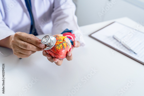 Doctor with anatomical model of human heart Cardiologist supports the heart. heart diagnose medical checkup cardiologist in examination room
