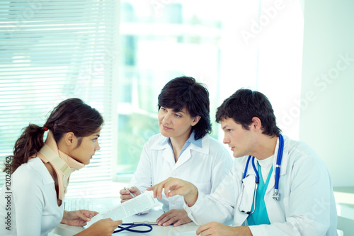 hospital, clinic, emergency, room, office, accident, man, woman, doctor, healer, practitioner, female, patient, medicals, health, care, medicine, broken, neck, physical, injury, braces, consultation, recommendation, instructing, discussing, occupation, workplace