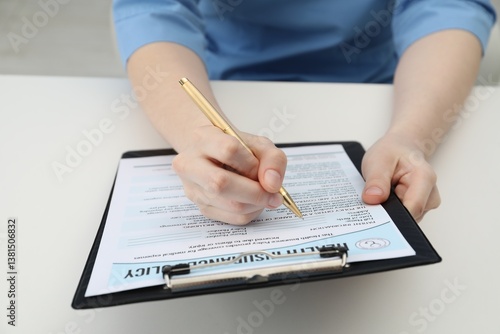 Doctor with pen filling out health insurance policy at white table in clinic, closeup