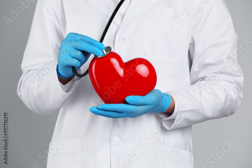 Doctor with stethoscope and red heart on grey background, closeup