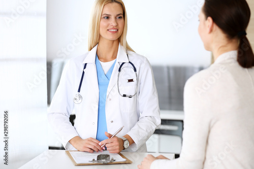 Doctor woman at work in hospital excited and happy of consulting female patient. Blonde physician controls medication history records and exam results while using clipboard. Medicine and healthcare