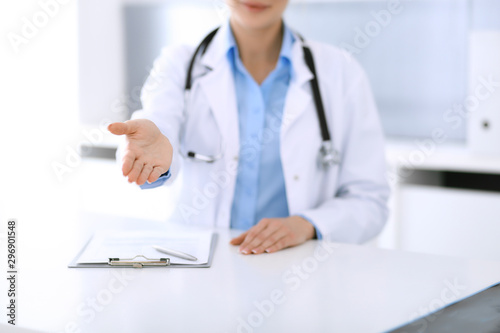 Doctor woman showing helping hand. Perfect medical service in clinic. Happy future in medicine and healthcare