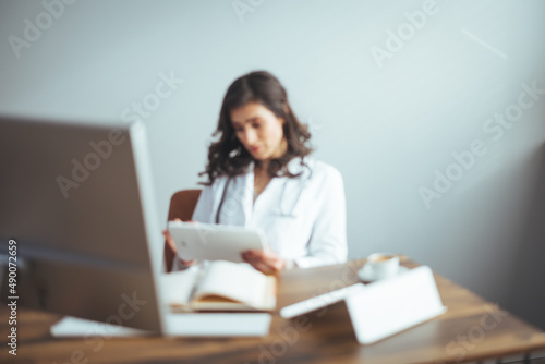 Doctor working at office desk. Female doctor sitting at the table writing in documents and working on laptop computer at office. Female doctor in a modern office clinic / hospital