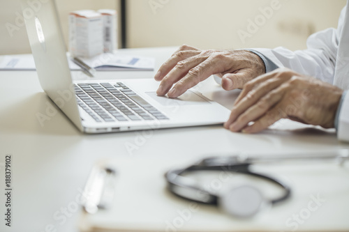 caucasian, doctor, hospital, stethoscope, arm, care, clinic, coat, communication, cropped, digital, hand, health, health care, holding, indoor, insurance, job, laboratory, laptop, lifestyle, male, man, medicine, modern, occupation, office, 1, people, practitioner, profession, professional, sitting, specialist, studio, table, technology, treatment, type, typing, uniform, using, white, work, working