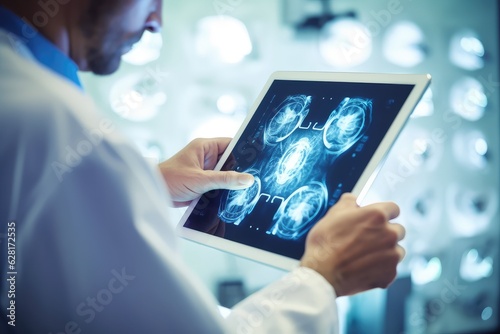 Doctors analyzing brain MRI scans on digital tablet in clinic. Photo generative AI