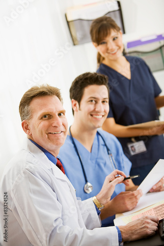 people, caucasian, happy, cheerful, smiling, toothy smile, man, male, woman, female, asian american, asian, doctor, medicals, nurse, physician, scrub, labcoat, uniform, stethoscope, health, team, 20s, 50s, job, occupation, working, clinic, office, sitting, file, form, reading, check-up, discussion, talking, learning, listening, intern