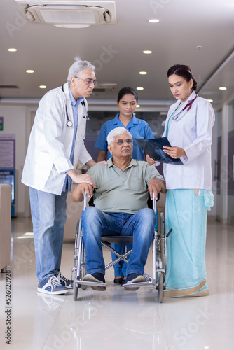 Doctors comforting disabled elderly patient in wheelchair at hospital