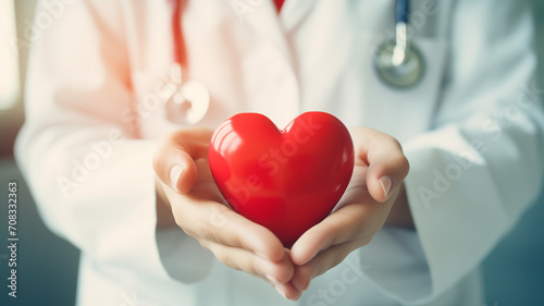 Doctor's hand holding a red heart shape in a hospital. love