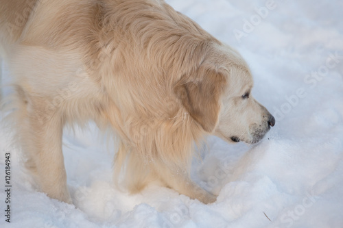 dog breed golden retriever playing in the snow in the winter