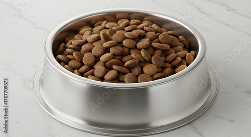 dog, food, bowl, pet, metal, brown, round, animal, feeding, nourishment, petfood, healthy, foodstuff, closeup, isolated, still life, silver, grey, granular, dietitian, dietary, studio, health, wellness, care