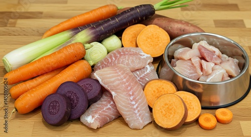 food, prepare, fresh, healthy, raw, clean, studio, wooden, table, day, nourishment, diet, ingredient, meal, dog, fish, chicken, carrot, sweet potato, leek, bowl, meat, slice, cut, dog food, raw food, pet, animal, cookery
