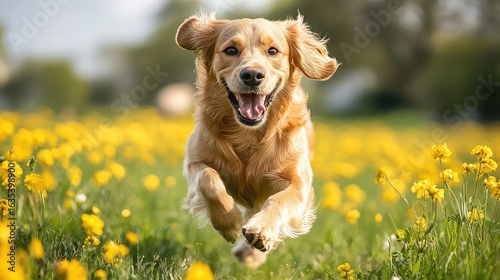 dog, joyful, running, field, yellow, flower, pet, happy, nature, playful, meadow, blooming, spring, wild, energy, motion, animal, grass, sunny, freedom, gold, fun, fast, floral, paw, tail, breeze, vibrant, joy, joyfully, through