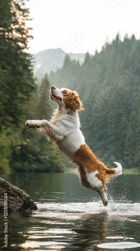 dog, jumping, lake, water, forest, summer, nature, playful, happy, animal, canino, pet, fun, outdoors, adventure, wildlife, freedom, energy, excitement, active, majestic, beautiful, landscape, scenic, mountain, tree, greenery, splash, paw, fur, adorable, cute, loyal, companion, friends, happiness, joy, relaxation, calmness, serenity, vibrant, colours, photo, image, picture, stock