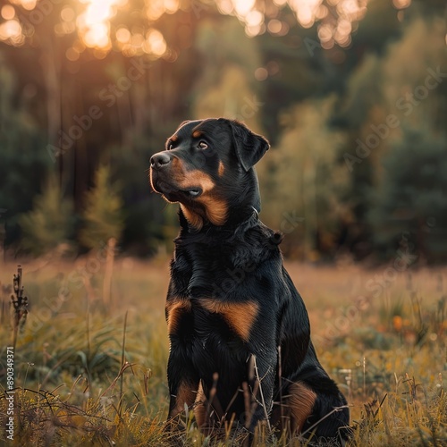 Dog of the Rottweiler breed sits on meadow under trees in the wild against the background of forest and sky