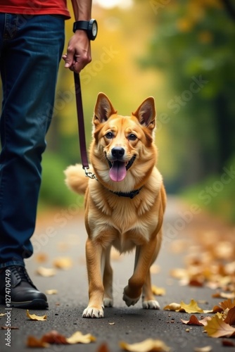 Dog on leash with owner's hand holding the other end, pet ownership, walking, animal friendship