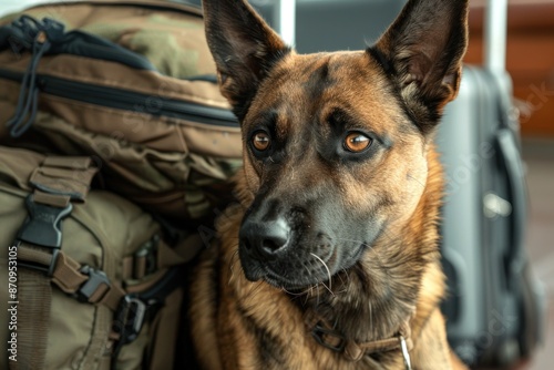 Dog sniffs luggage, search for drugs and weapons. ai generative