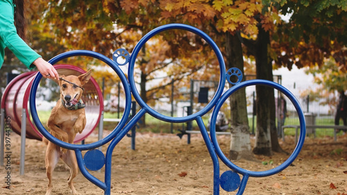 sand, dog, training, ring, jumping, outdoors, happy, mixed, breed, chart, race, orange, yellow, tongue, pet, best friend, loyal, loyalty, playing, show, animal, human relationships, sustainability, obedient, accurateness, devoted, trustworthy, warm, fast, active, joy, play, domestic, cute, canino, playful, mammal, fun, park, friends, woman, trainer, mask