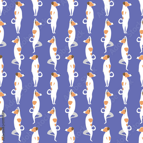 Dog yoga seamless pattern as wallpaper, background, texture for printing on fabric, textile, flat vector stock illustration with jack russell terrier isolated as endless pattern