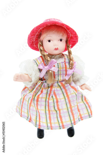 doll, toy, figurine, ornament, plait, hat, dress, sitting, cute, innocent, feminine, white background, cut-out, cut-out, isolated, object, vertical, studio shot, still life
