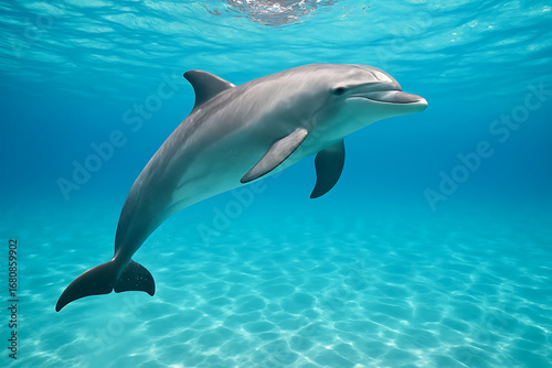 Dolphin swims gracefully underwater, showcasing its sleek body and playful nature vibrant blue