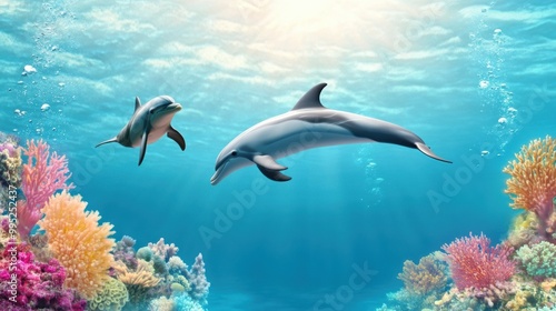 Dolphins Swimming in Vibrant Coral Reef Underwater Scene