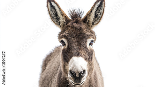 donkey, animal, portrait, white background, gaze, ear, fur, closeup, mammal, nature, wildlife, farm, farm animal, cute, expression, face, domestic, pet, brown, fluffy, staring, isolated, head, front view, looking, peaceful, serene, calm, gentle, curious