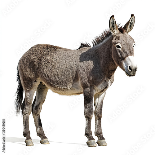 donkey, animal, white background, standing, calm, fur, ear, hoof, tail, mammal, farm animal, farm, domestic, grey, portrait, isolated, nature, wildlife, equine, peaceful, serene, half face, full body, rural, agriculture, pet, countryside, gentle, herbivore