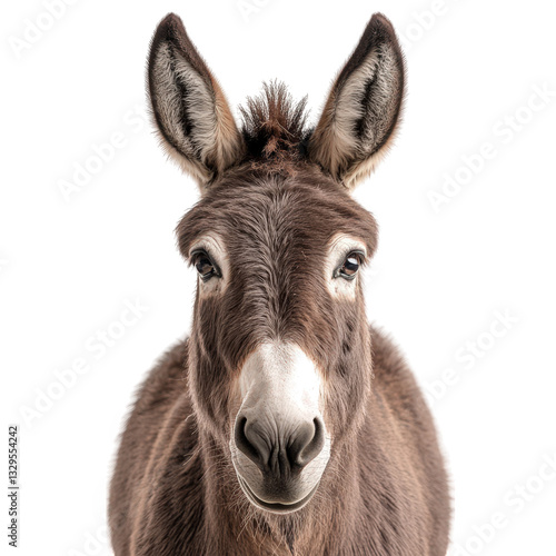 donkey's face showcasing its expressive features and large ears against a white background. animal's friendly demeanor and detailed fur texture