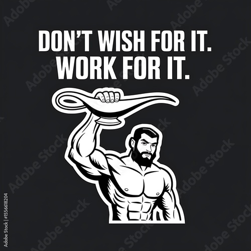 Don’t Wish for It. Work for It.—genie lamp crossed out, muscular arm icon, with thick white sticker-style outline around the design, solid black background, high contrast, centered composition