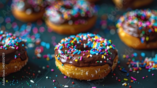 Donuts topped with chocolate frosting and vibrant sprinkles