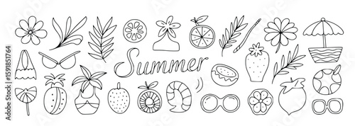 Doodle art with summer theme shows beach accessories and tropical fruits in black and white