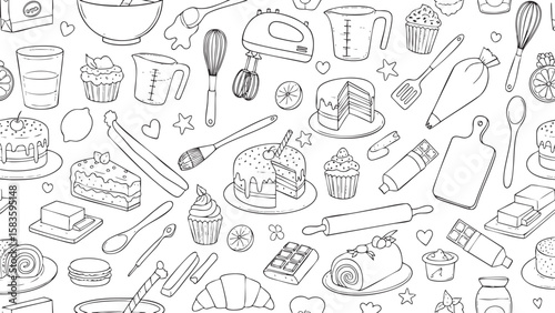 baking, kitchen, pattern, doodle, seamless, scrapbook, clip art, trendy, vignetting, textile, artwork, outline, print, minimalist, monochrome, scrapbooking, artistic, graphic, patterned, theme, tool, simple, surface, pin, wallpaper, object, drawing, preparation, wrapping, treat, ingredient, utensil, isolated, rolling, retro, oven, treat, cupcake, adorable, cartoon, mixer, receipe, set, white, vintage, element, template, art, kitchen utensile
