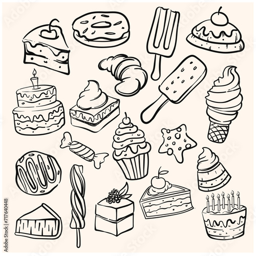 Doodle desserts and sweets. Line art illustration. Bakery Cartoon doodle