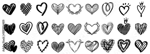 Doodle hearts drawn by hand. Grunge scrawls, chalk scribbles, rough brush strokes, underlines and circles