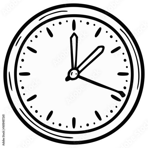 Doodle Style Wall Clock Displaying Five Minutes to Twelve Black and White Design
