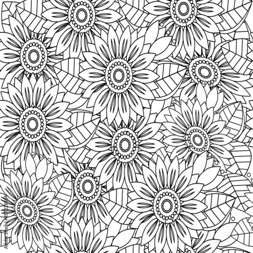 Doodles seamless pattern. Floral picture in black and white for adult coloring books. Coloring page of monochrome flowers and leafs.